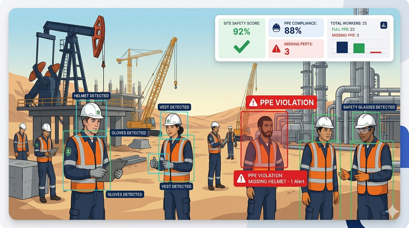 AI PPE detection helps Saudi HSE teams monitor helmets, vests, masks, harnesses, and other safety equipment in real time using existing CCTV cameras.